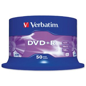 DVD+R. Ideal for video audio multimedia imaging archiving etc. Read compatible with DVD-ROM and DVD-Video players. Speed: 16x. Capacity: 4.7GB. Spindle of 50 disks. Read more details..